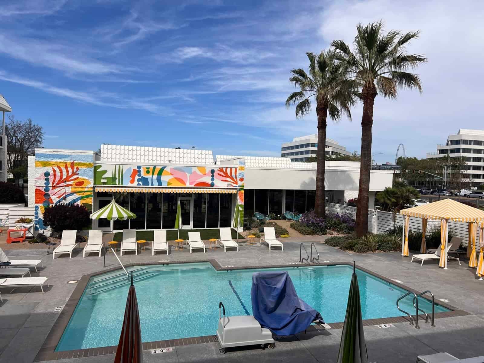 Walking in, I had that moment of, oh, this is actually pretty cute. The Avatar leans hard into a mid-century California vibe. Bright colors, retro furniture, and a pool area that feels like it’s trying very hard to convince you that you’re in Palm Springs and not five minutes from a freeway.